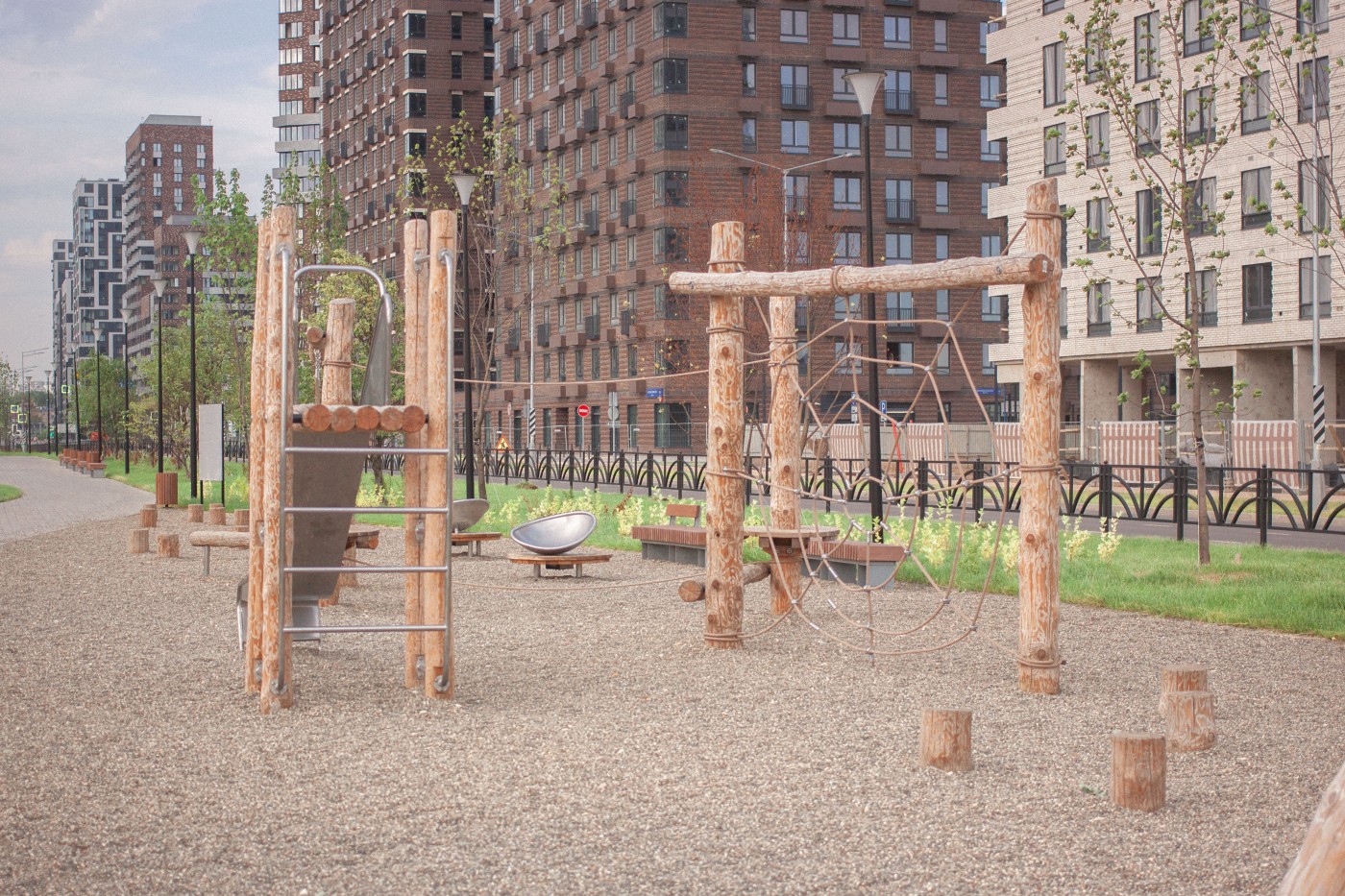 Мы экспериментируем с использованием габионов в дизайне площадок – это металлические сетчатые конструкции, заполненные камнями. Они могут служить не только декоративными элементами, но и скамейками, подпорными стенами или даже элементами для лазания.