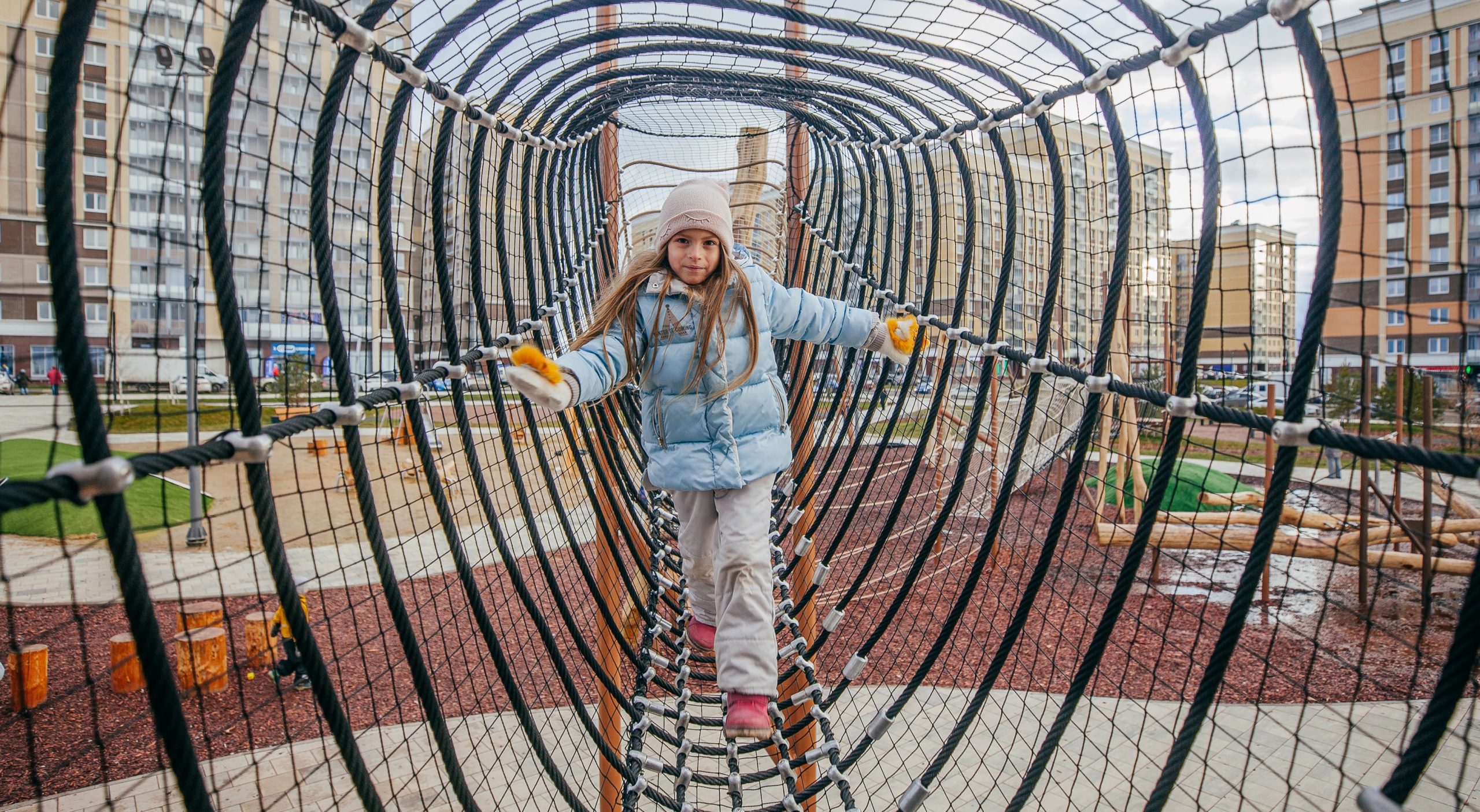 - Крупная моторика: Лазалки, канаты, балансиры, горки, туннели, батуты, веревочные лестницы.