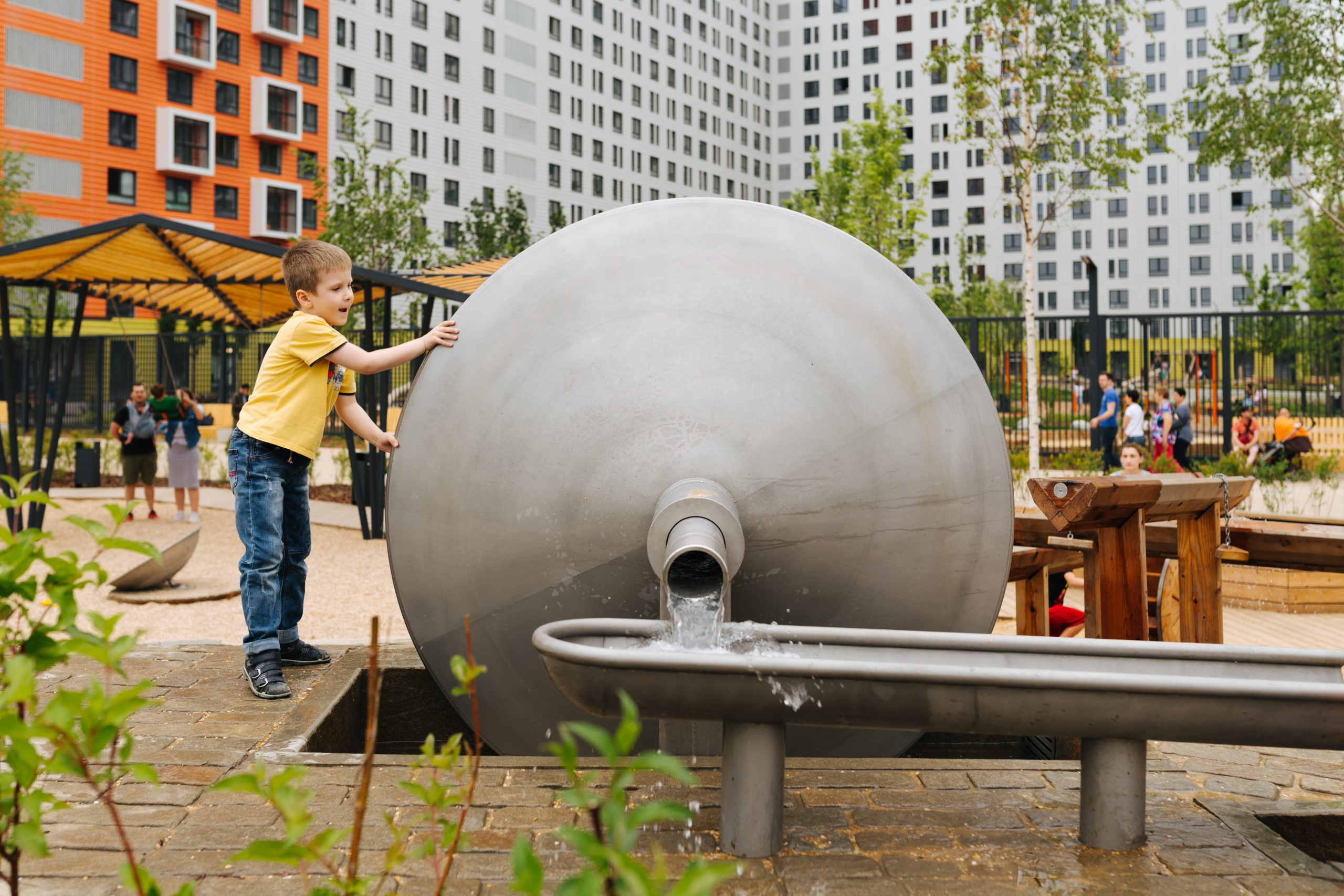 Мы также используем игровые элементы, связанные с водой (например, ручейки, водяные мельницы), которые не только освежают в жаркий день, но и предлагают безграничные возможности для экспериментов и сенсорной игры.