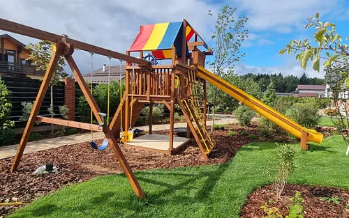 - Использование натуральных материалов: Дерево – наш фаворит. Мы применяем натуральное дерево для создания беседок, домиков, элементов лазания. При этом мы всегда уделяем внимание уходу и обработке натурального дерева, чтобы оно было долговечным и безопасным, защищенным от гниения и вредителей.