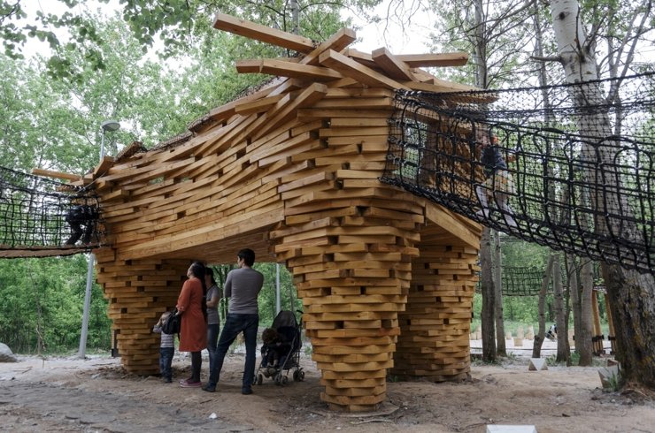 - Лазание: Разнообразные лазалки для разных уровней подготовки, веревочные лестницы, сетчатые конструкции, стены для лазания.